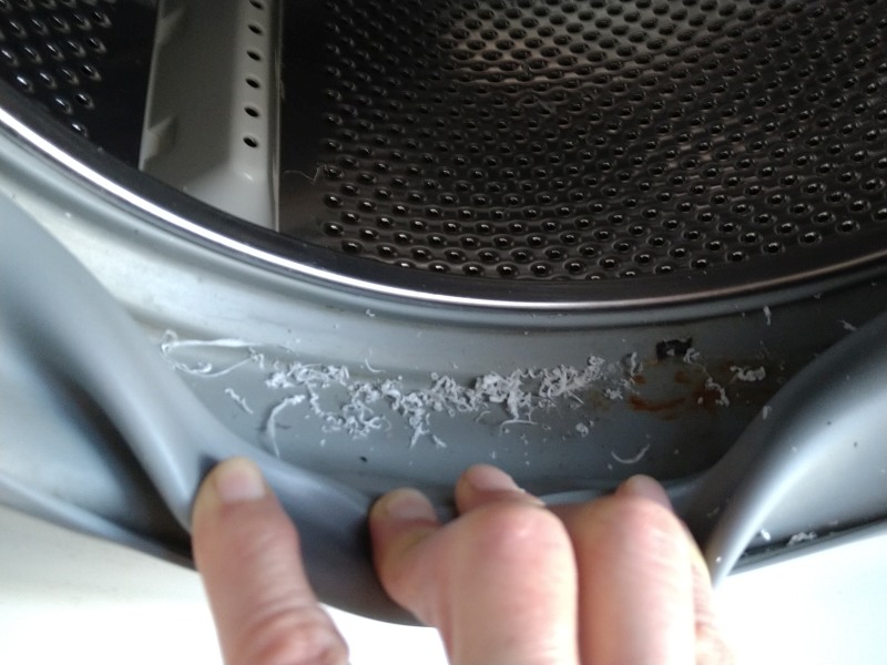 de nylon était répandu par tout le tambour. Celui-ci est désaxé par rapport à l'hublot de la bouche de charge (frontale).