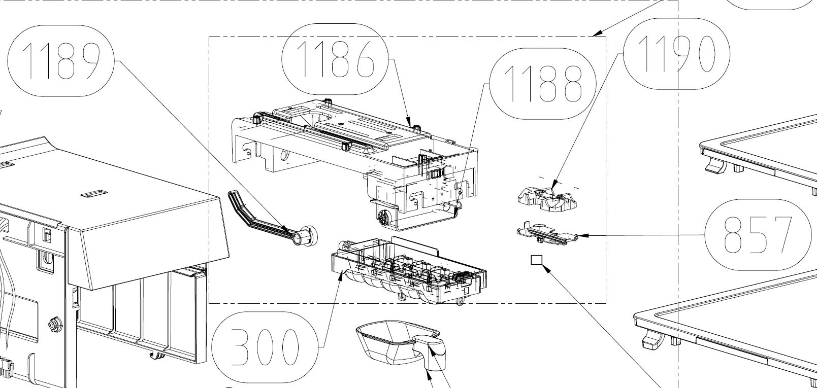 L'ennui c'est que l'écart dans le bac à glaçon (rep 1186) est bien trop faible pour recevoir les 2 extrémités du moule plastique. J'ai peur de le casser en essayant de l'enficher.